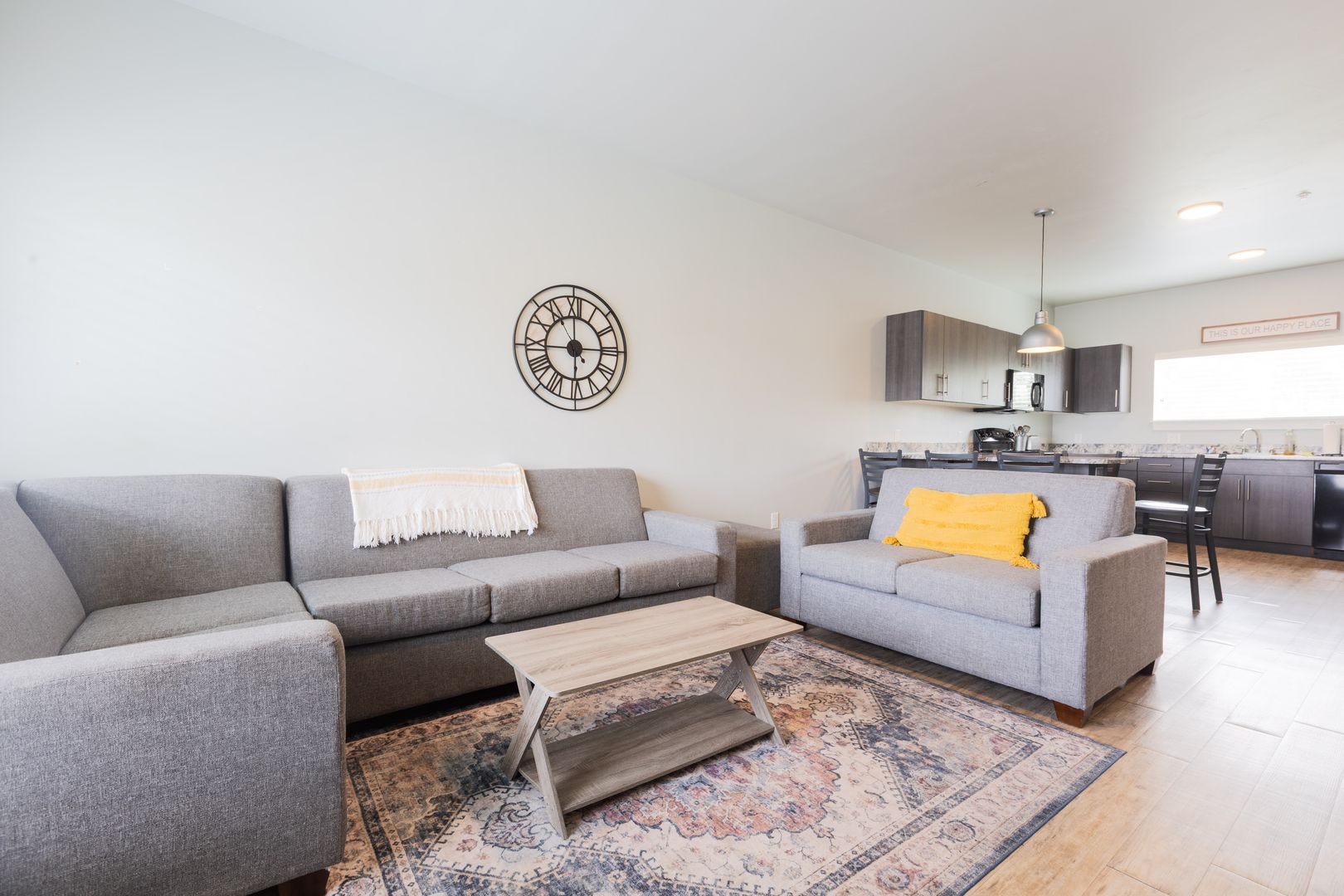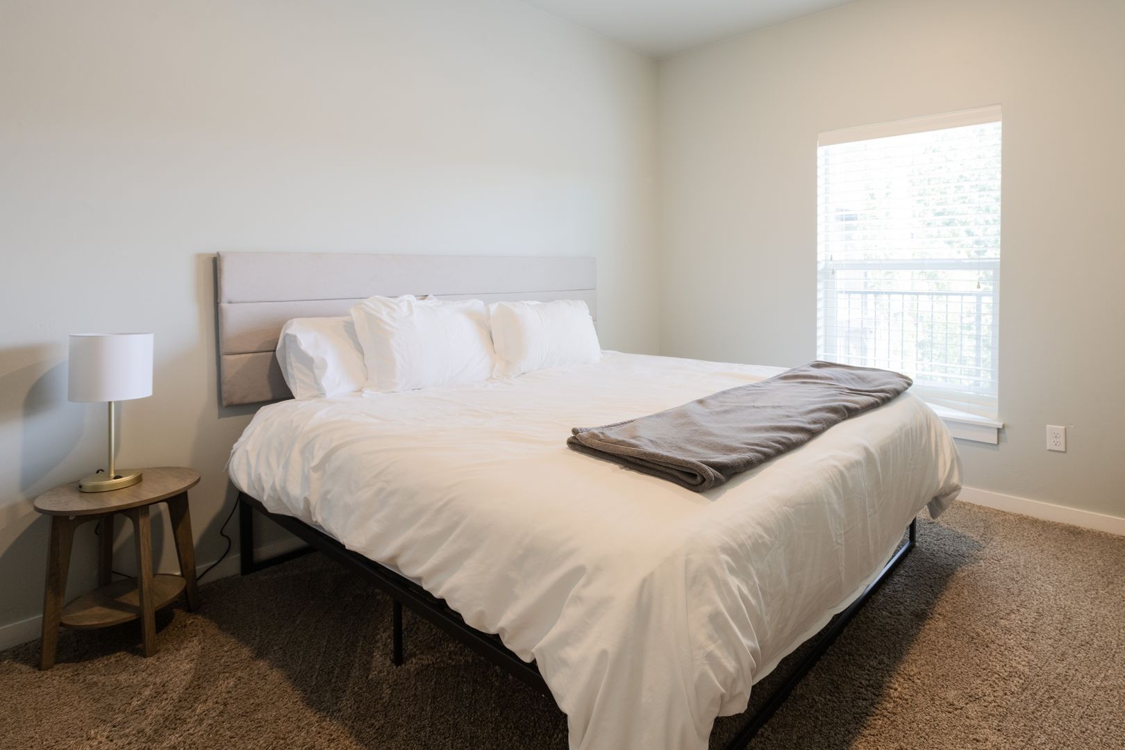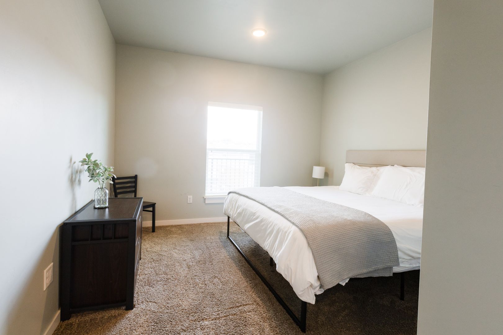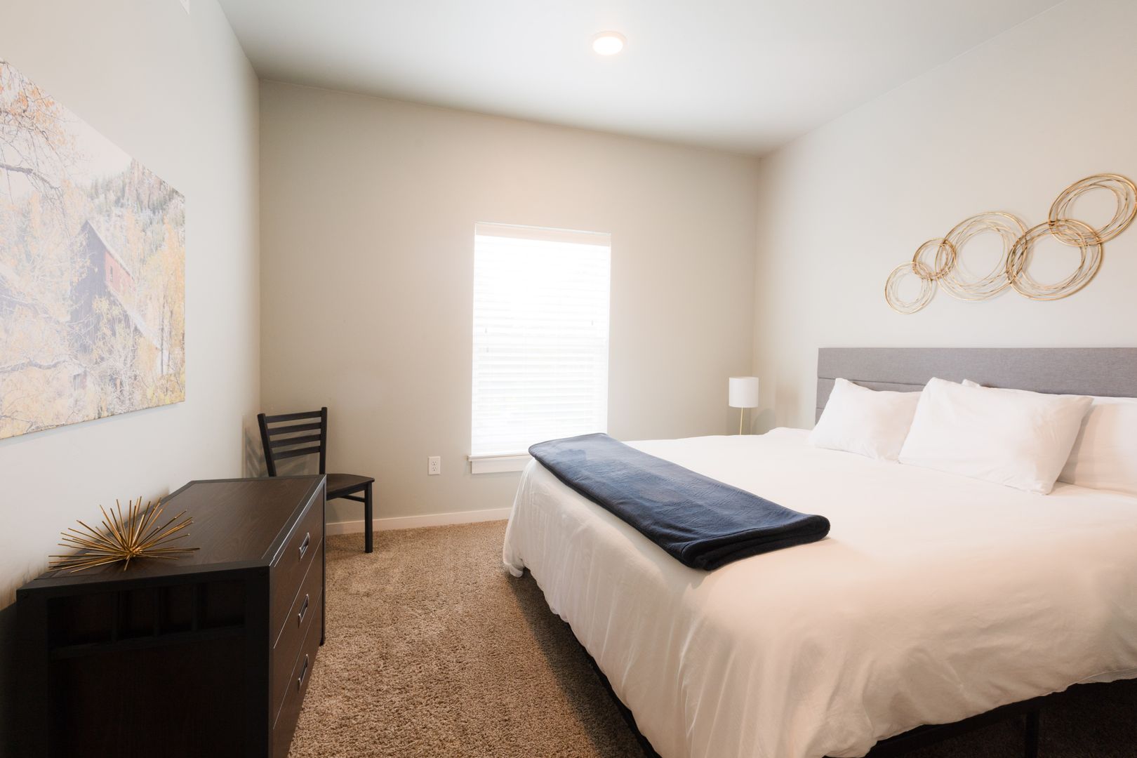 This private room comes furnished with a king bed. This apartment in Rexburg offers modern comfort and convenience, perfect for students or professionals seeking short- or mid-term housing. The bright living space features large windows, a comfortable layout, and a wall-mounted Smart TV, creating a welcoming spot to relax or gather. The fully equipped kitchen comes with a stove, oven, refrigerator, dishwasher, microwave, cookware, and plenty of storage, while the built-in breakfast bar seats six and works equally well for meals, study sessions, or as a convenient workspace.