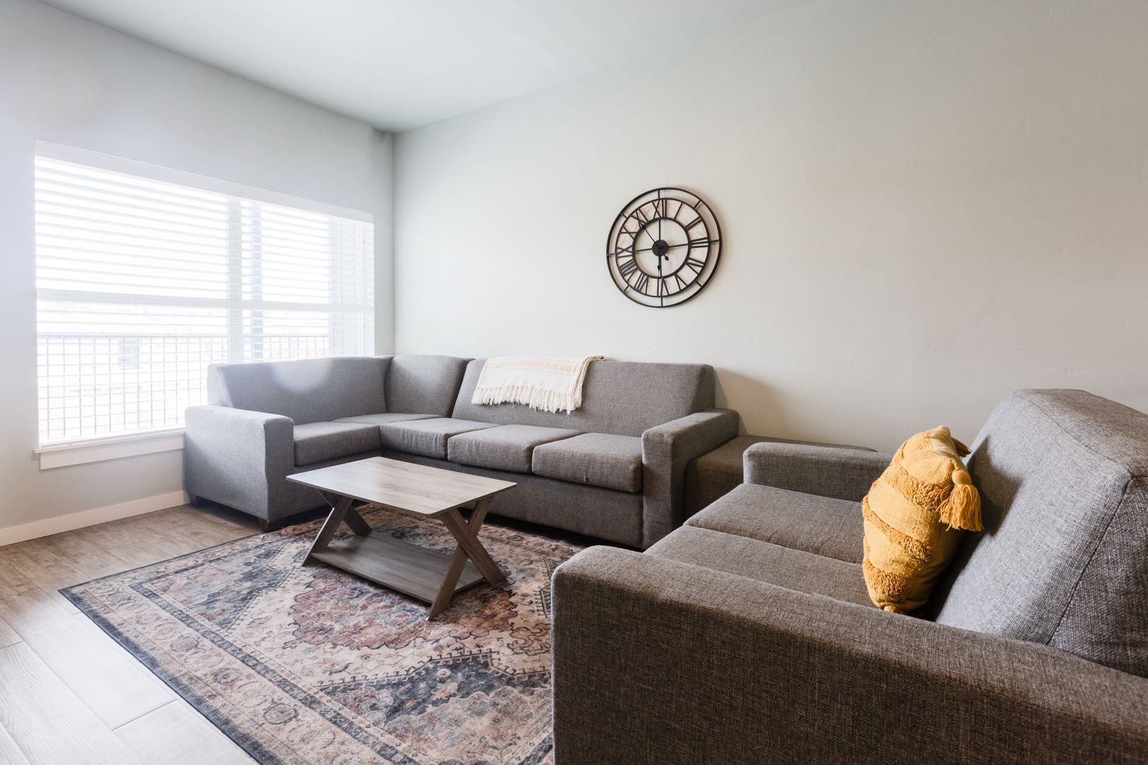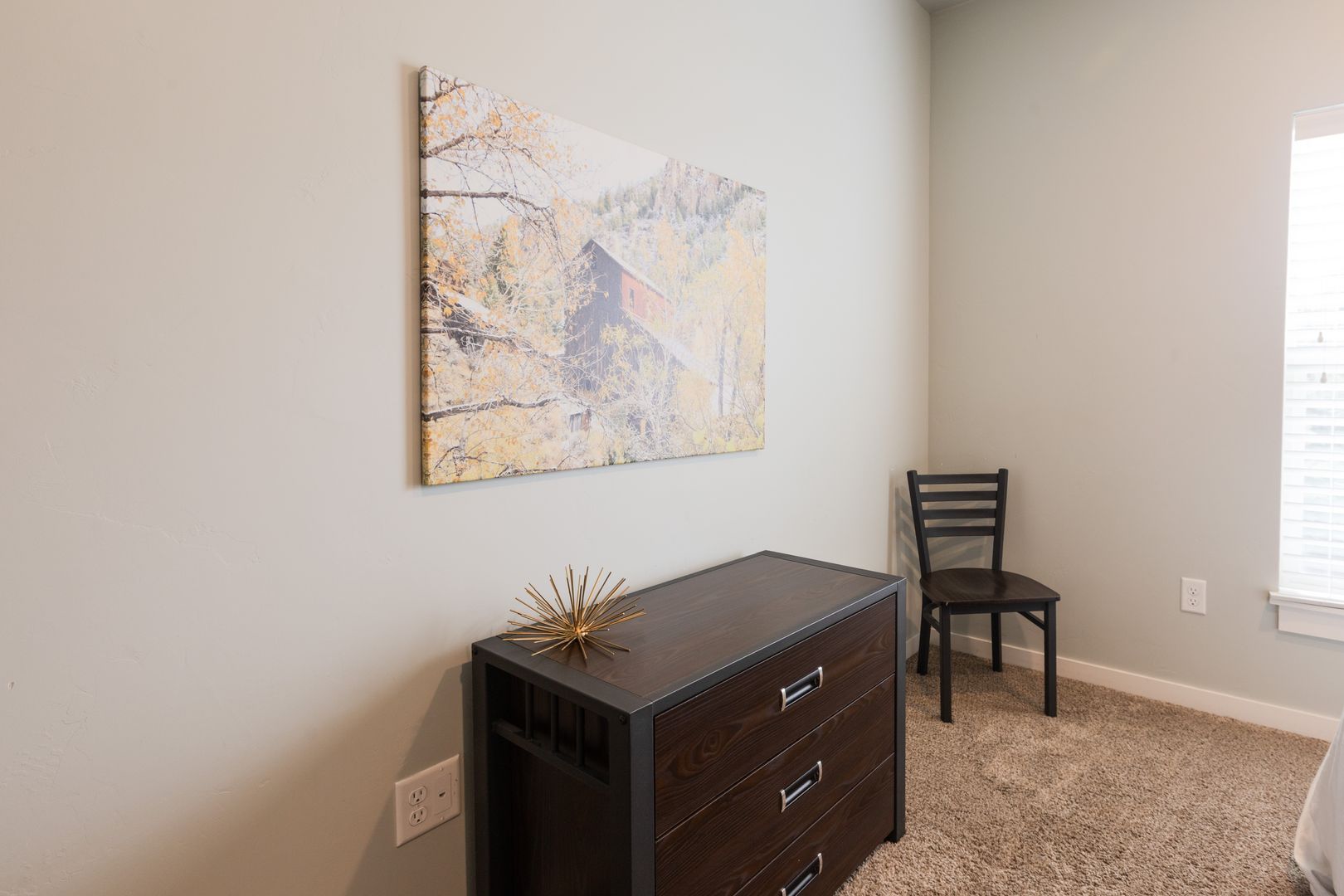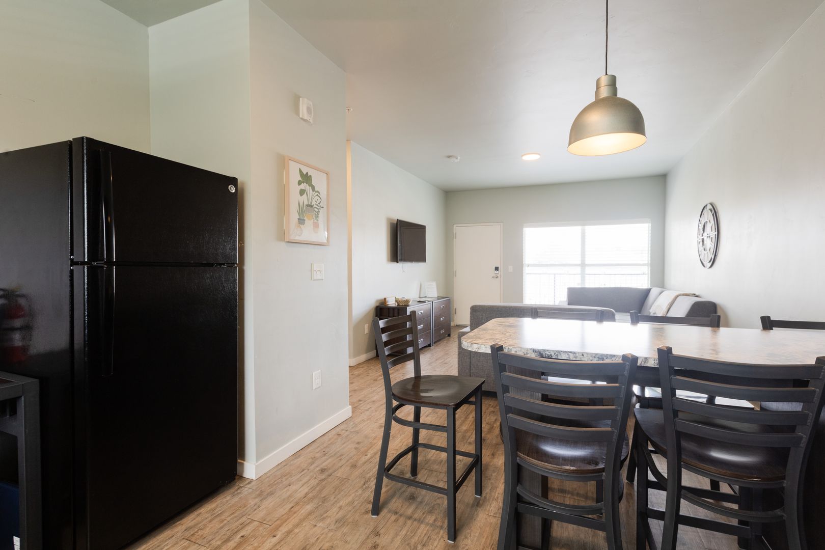 This private room comes furnished with a king bed. This apartment in Rexburg offers modern comfort and convenience, perfect for students or professionals seeking short- or mid-term housing. The bright living space features large windows, a comfortable layout, and a wall-mounted Smart TV, creating a welcoming spot to relax or gather. The fully equipped kitchen comes with a stove, oven, refrigerator, dishwasher, microwave, cookware, and plenty of storage, while the built-in breakfast bar seats six and works equally well for meals, study sessions, or as a convenient workspace.
