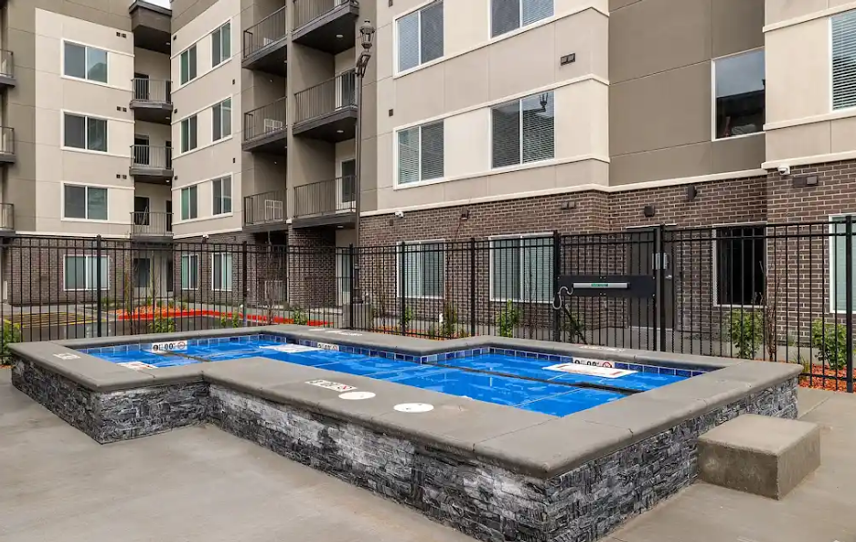 Resort-style amenities including a fully equipped fitness center, relaxing outdoor hot tub, grilling areas, and scenic walking paths along the river