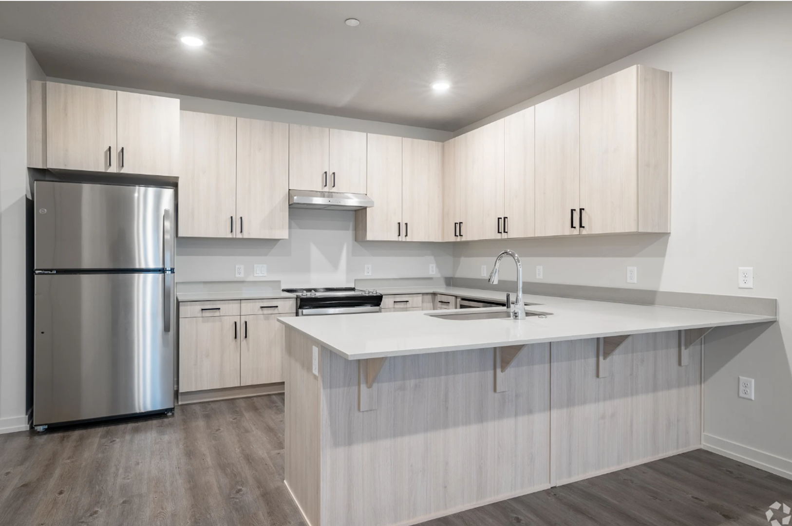 Modern kitchens featuring stainless steel appliances, elegant flooring, and contemporary finishes
